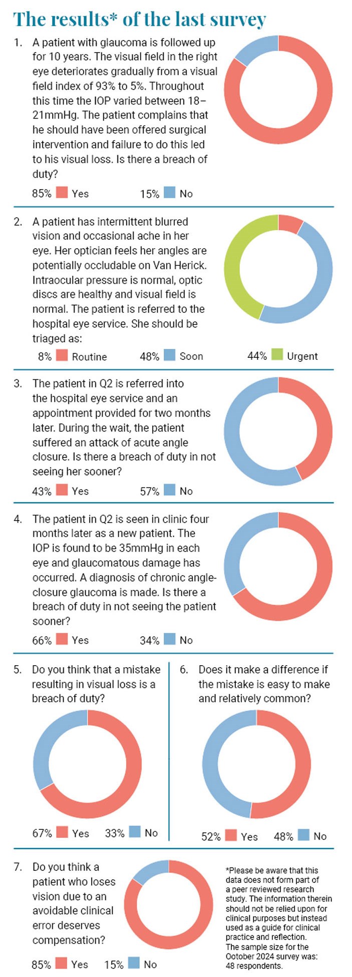 The final question followed on from the issue of no-fault compensation. When asked if you feel that a patient who loses vision due to an avoidable clinical error should receive compensation, most of you felt they should, which I support. Fifteen percent of you were clearly having a bad day and felt they did not.