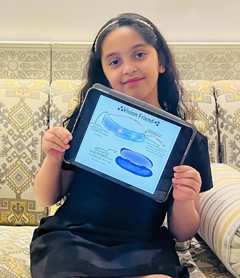 Lama Albadeen, 8, from Saudi Arabia, was selected as the winner of the global competition with her innovative design: Vision Friend. Her design is made from eco-friendly materials like bamboo and recycled plastic, equipped with an alarm, safety tracker, and a multifunctional charging case. “I wanted to include a camera and sensors to detect obstacles – such as doors, stairs, and slippery areas – alerting users with sounds and vibrations in Vision Friend to make life easier for people who are blind or have low vision to help them stay safe wherever they go,” said Lama, reflecting on her inspiration behind her glasses design.