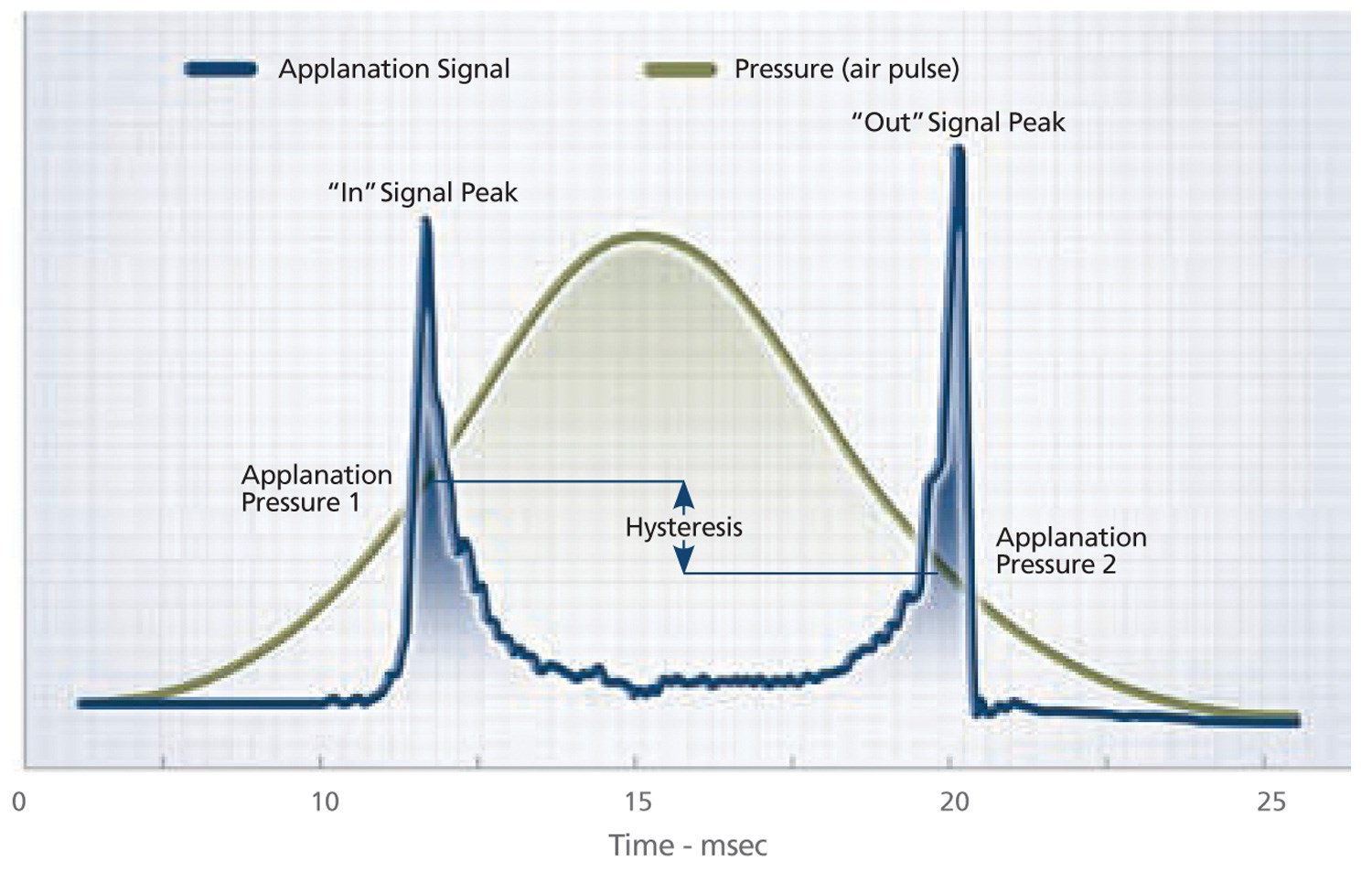 The ORA uses a quick jet of air to indent the cornea and an electro-optical system is used to measure the applanation pressure, once when the cornea is displaced inward, and again when it is displaced outward. The cornea has viscoelastic properties and therefore it resists inward movement caused by the air pulse and reverts to its primary position due to its elastic nature. There is a delay between these applanation events. The first inward applanation pressure is termed pressure 1 (P1) and the second or outward pressure event is classified as pressure 2 (P2) (Figure 1).