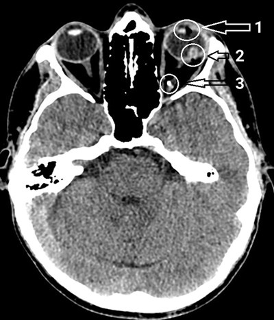 CT scan from case one, annotated: Arrow 1 (top) indicates a gap in the lens of the left eye, which has been bisected by the pellet; arrow 2 (middle) indicates a break in posterior pole of the eye, where the pellet passed through the retina and the sclera; arrow 3 (bottom) indicates the pellet, lying posteriorly in the orbit.