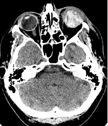 CT scan case three: The left eye is completely disrupted with no internal recognisable features. The globe is protruding forwards due to swelling of the soft tissues within the orbit.