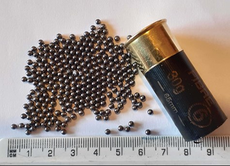 Shotgun cartridge: Showing the contents of a No. 6 shot, 30g cartridge: approximately 175 individual lead pellets, each pellet 2.5mm diameter, total mass of all pellets 30g.