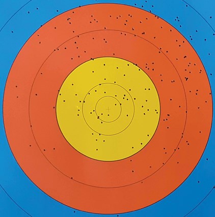 Shotgun target showing the scatter of shotgun pellets over a target where the outer edge of the orange rings measure 32cm, and the central yellow area corresponds roughly to the size of a human face. No. 6 shot, range 10m. Scatter increases with distance, and becomes very wide once the range increases beyond 10m. Pheasants are usually struck by very few pellets, and ocular injuries usually are caused by a single pellet.