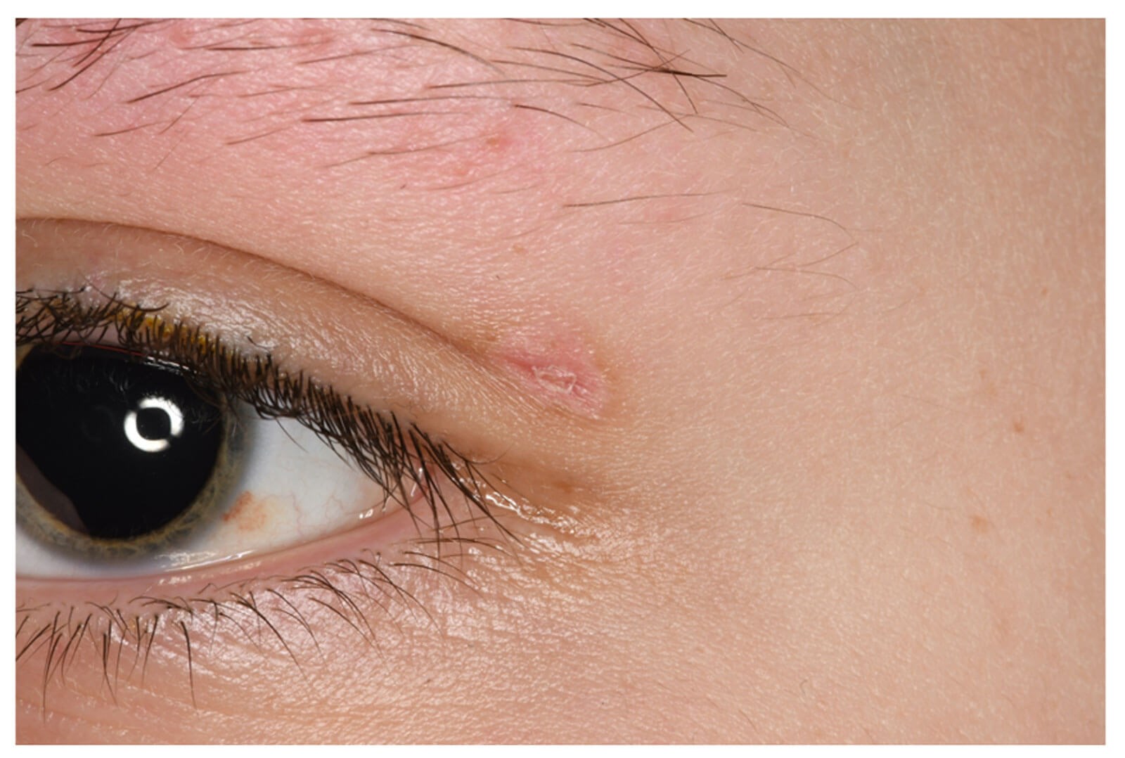 Figure 1: External eye image of the left eye with small subconjunctival haemorrhage at 4 o’clock and a healing sub-brow laceration.