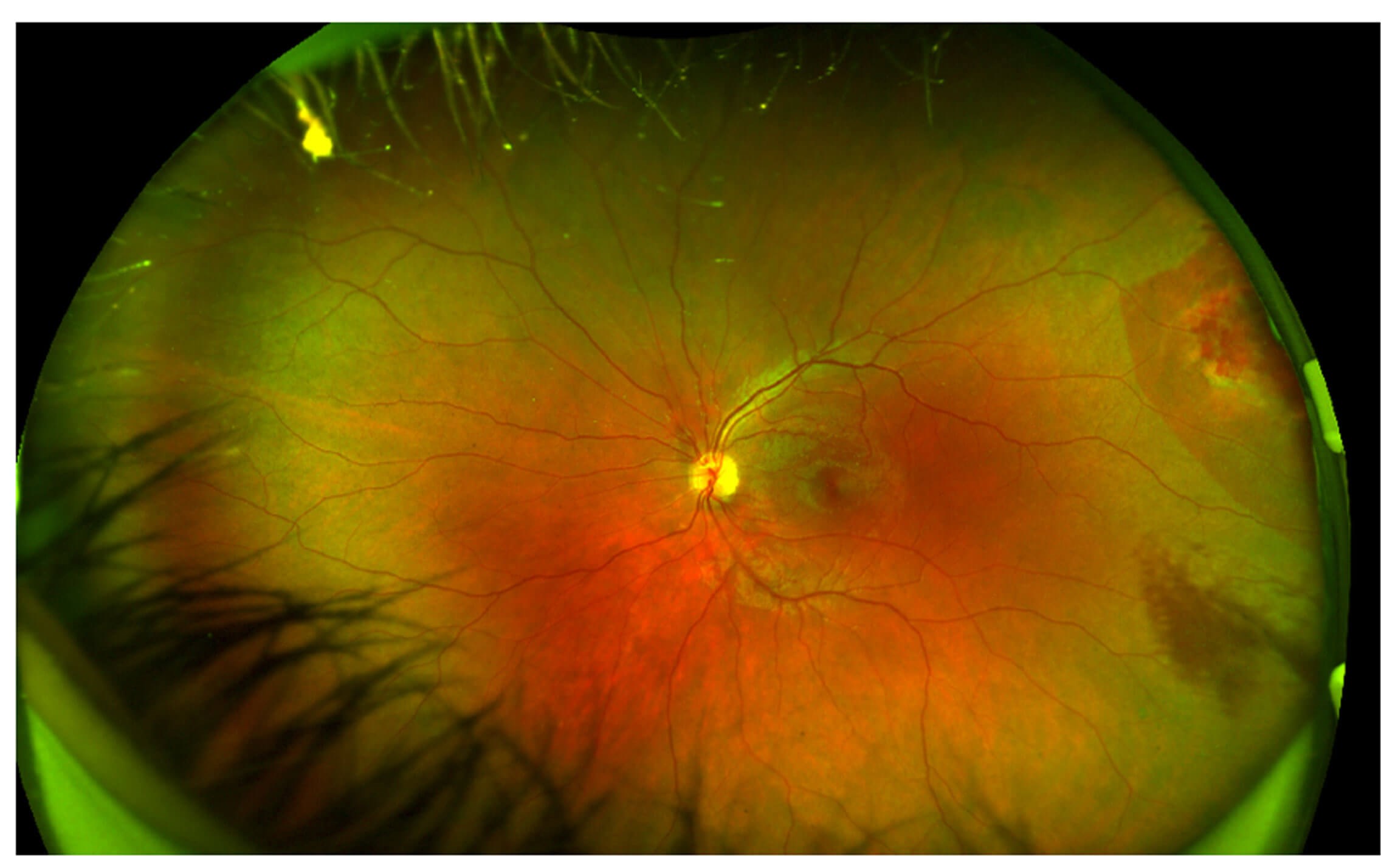 Figure 2: Wide field imaging of retina of the left eye showing mild optic disc swelling nasally and temporal choroidal rupture in the left eye.