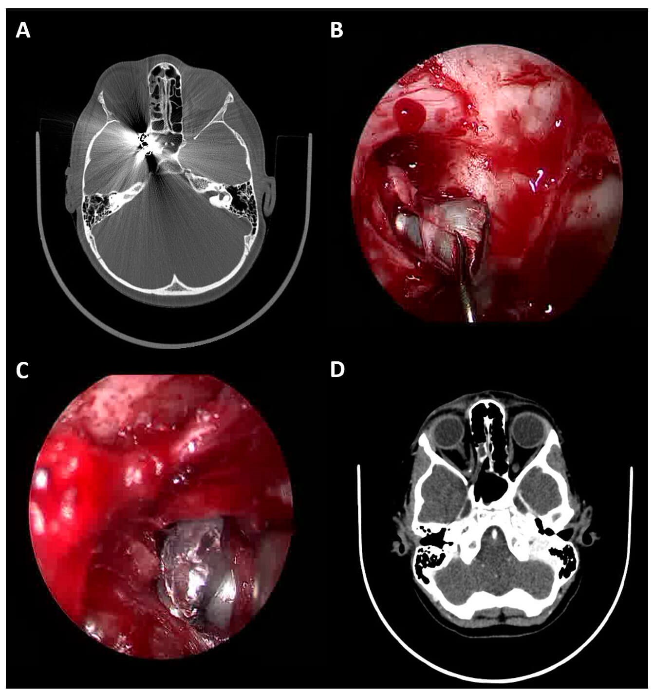 Figure 5: (a) axial plain CT head (bone window) showing two metallic foreign bodies at the orbital apex and within the optic canal; (b) endoscope image of pellet being extracted from the orbital apex via a trans-nasal route; (c) endoscope image of a second pellet being extracted from the orbital apex via a superior skin crease approach; (d) follow up axial CT head (brain window) showing retained small metallic fragments following removal of the two large pellets.