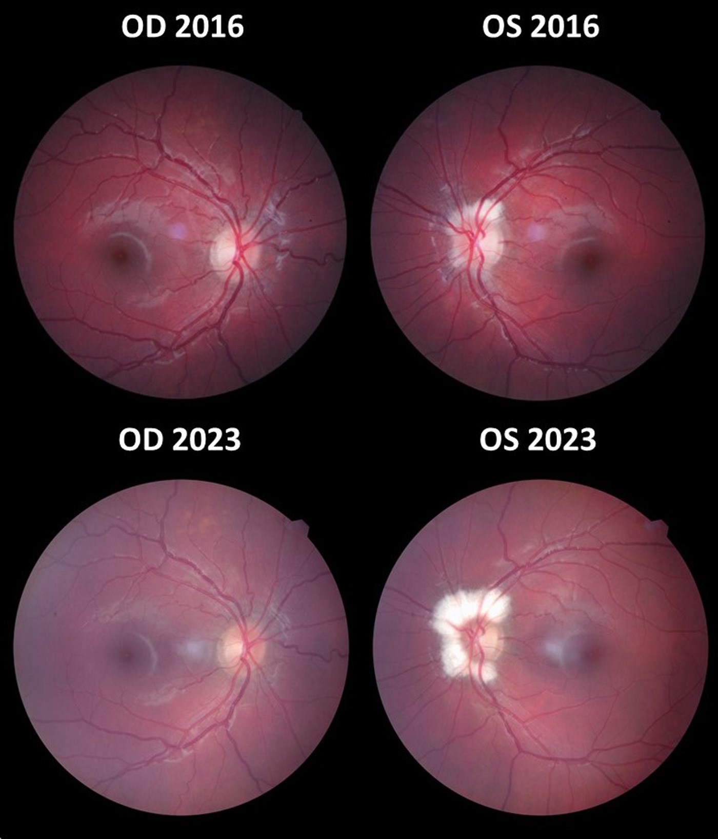 A 19-year-old Caucasian woman was referred from her optician to our neuro-ophthalmology clinic for evaluation of progressive myelination of the RNFL. The optician first observed myelinated RNFL in the patient’s left optic nerve head in 2016, then referred the patient to our clinic in August 2023 after noticing a significant increase in myelination (Figure 1). Fortuitously, she had previously been seen by a senior consultant paediatric ophthalmologist in our ophthalmology department aged 18 months for right periorbital cellulitis, whereupon fundoscopic examination was recorded as normal in both eyes, including normal appearance of both optic discs.