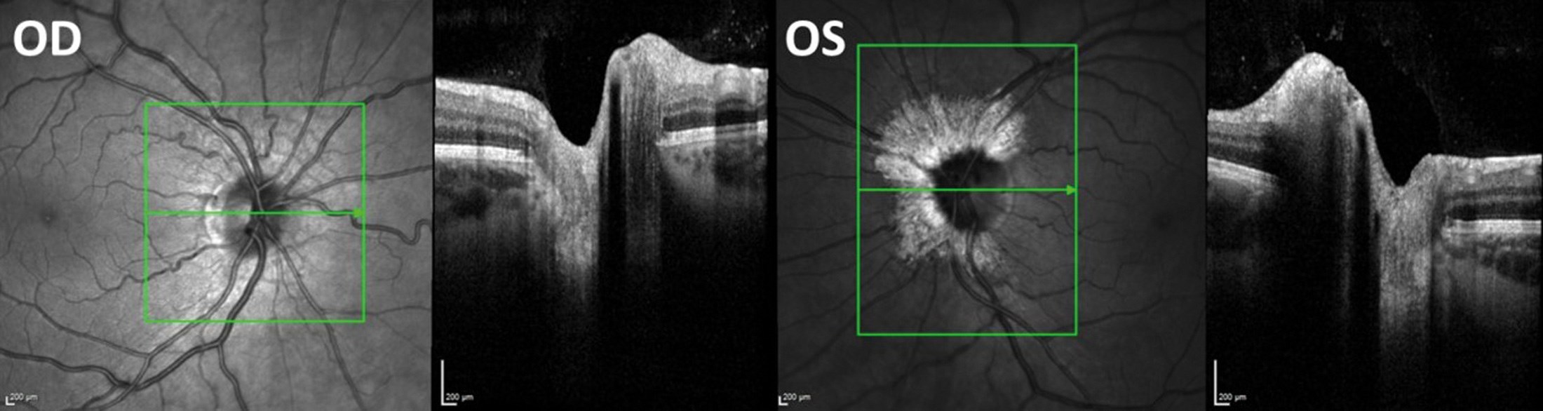 During our neuro-ophthalmological clinical assessment in August 2023, visual acuity was 0.10 in the right eye and 0.00 in the left eye. The patient reported no new visual changes. Intraocular pressure was 16mmHg in both eyes. Anterior segment examination was normal. Pupils were equal, round and reactive to light and accommodation. Dilated fundus examination of the right eye revealed a pink tilted disc with relatively small cup. Dilated fundus examination of the left eye revealed myelinated RNFL extending superiorly, nasally and inferiorly around the optic disc (Figure 1). Visual field testing using the Humphrey’s 24-2 model was normal in both eyes. Spectralis OCT imaging (Heidelberg Engineering, Heidelberg, Germany) was performed in both eyes, revealing myelination of the left RNFL (Figure 2); on infrared imaging, the myelinated RNFL appears white, most likely due to the high lipid content of myelin [4].