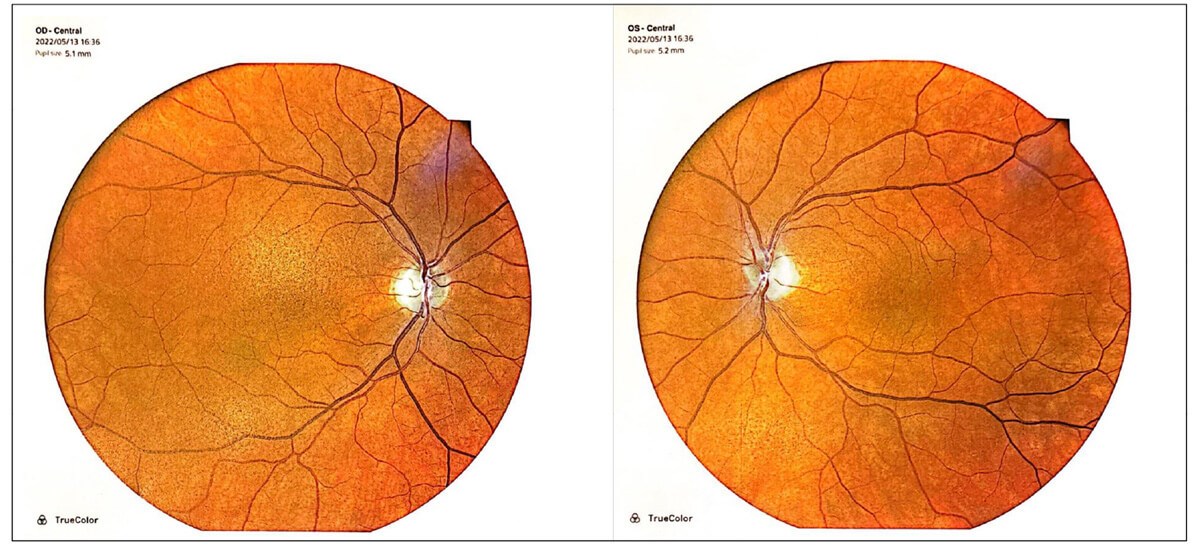 Figure 1: Fundal imaging showing bilateral pigmentary maculopathy and disc pallor.
