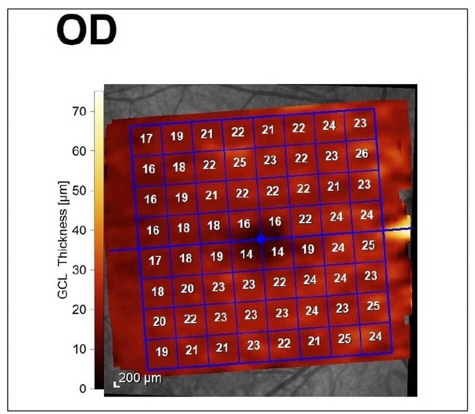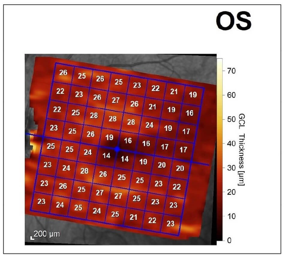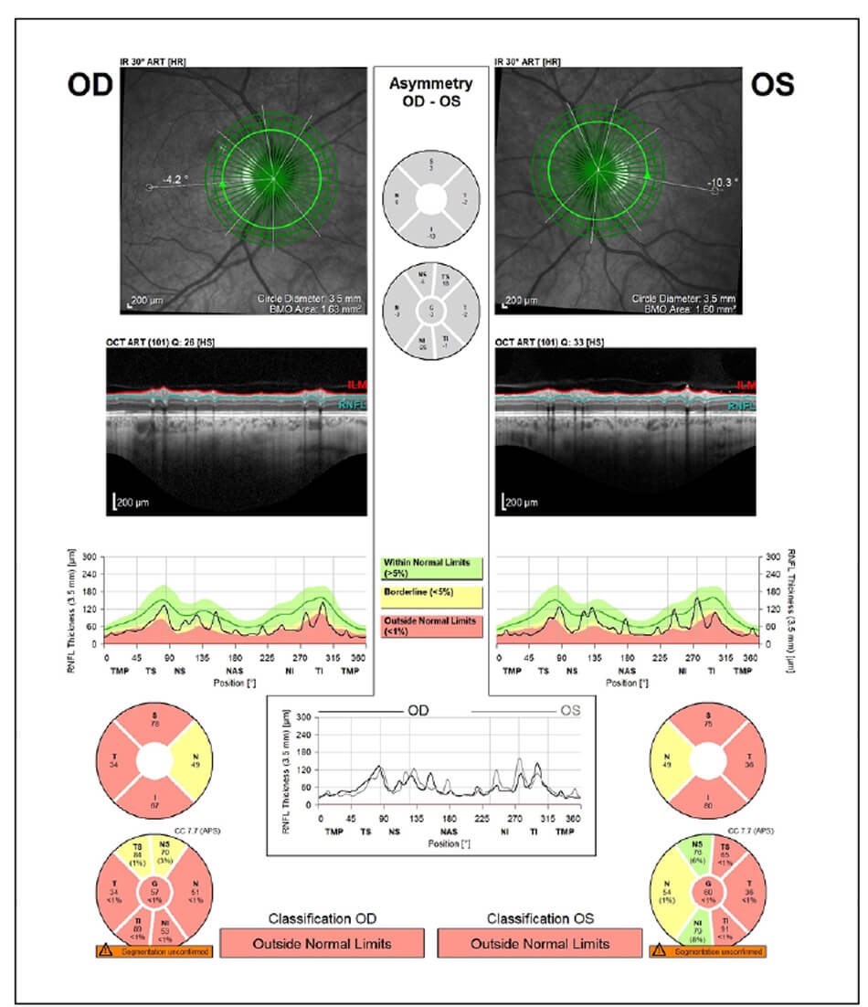Figure 2a: OCT revealed bilateral diffuse retinal nerve fibre layer thinning.
