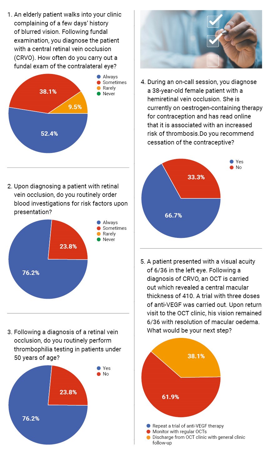 Often, CRVO reflects systemic vascular pathology that may affect both eyes. In our survey, 80% of respondents reported ‘always’ examining the contralateral eye when diagnosing CRVO, while 20% stated they did so only ‘sometimes’. According to the Royal College of Ophthalmologists (RCOphth), comprehensive fundal examination, including the unaffected eye, is essential in initial workup to detect signs of previous pathology, or bilateral disease, which may necessitate different systemic or ocular management strategies [2].