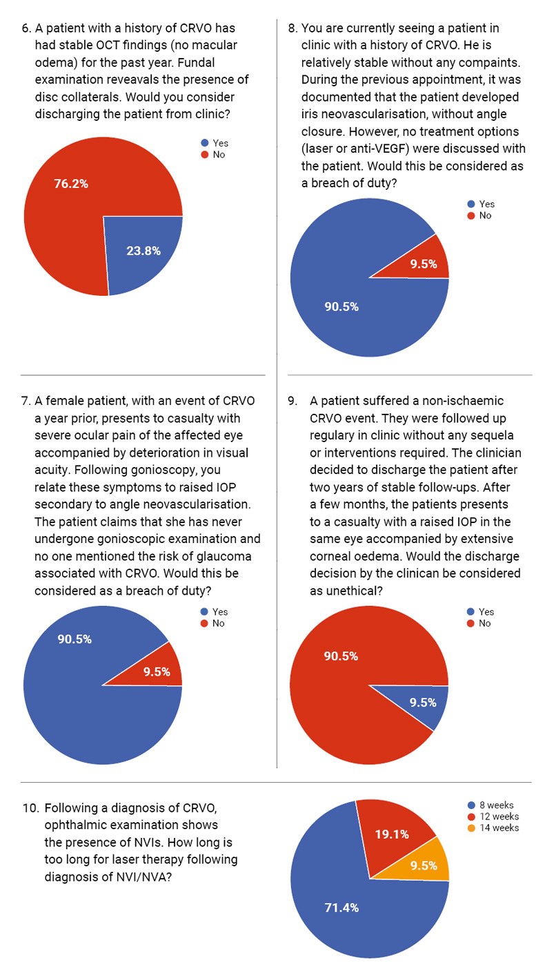 Two scenarios addressed complications related to neovascularisation. In the first, a patient presented with angle neovascularisation and claimed she had never undergone gonioscopy or been warned of the risk of glaucoma. All respondents agreed this constituted a breach of duty. Indeed, neovascular glaucoma is a known sight-threatening complication of ischaemic CRVO, and the Central Vein Occlusion Study (CVOS) recommends regular gonioscopic assessments within the first 6–12 months [10].