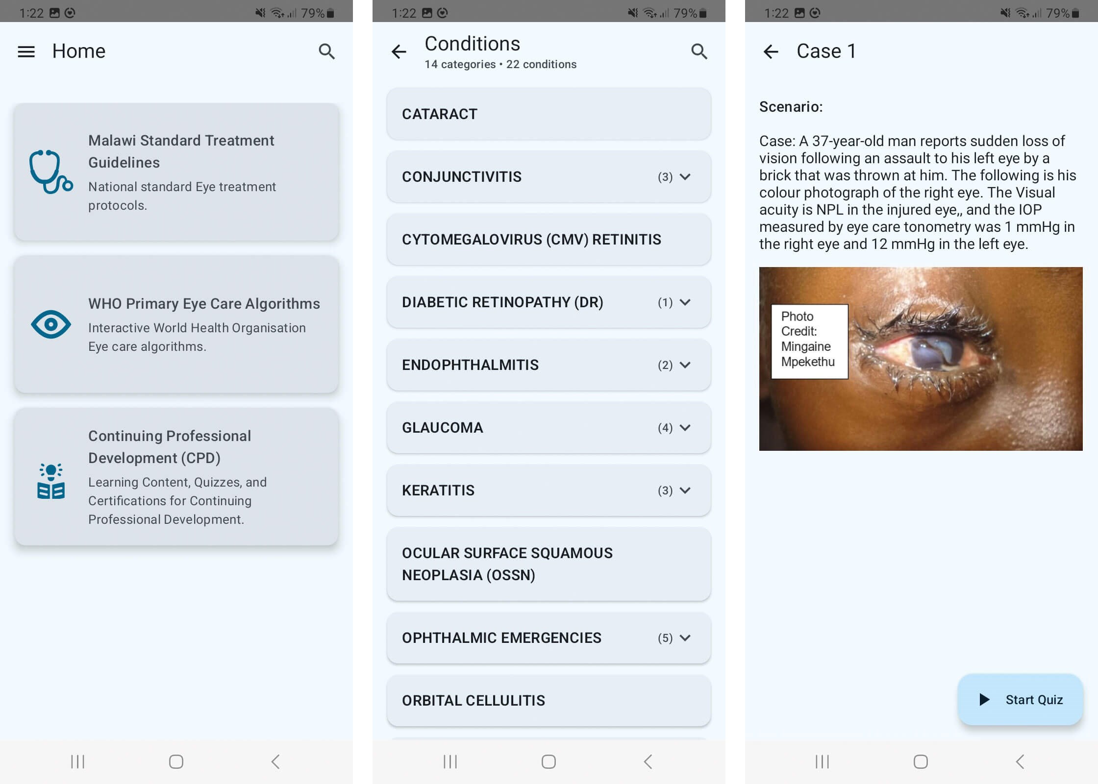 Many primary healthcare workers have access to tablets as part of the child immunisation programme and could also use the WHO primary eyecare algorithms to aid diagnosis and referral of eye conditions. The availability of patient information aims to empower all healthcare workers to accurately educate their patients in self-management of eye conditions and better inform them of what to expect and encourage attendance if referral to an eye hospital is recommended. The engagement with content on continuous learning and development for eye healthcare workers can now be easily demonstrated with this app. Collaboration with the Ministry of Health and Medical Council of Malawi was very important in standardising the CPD content and awarding of points.