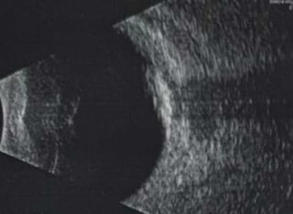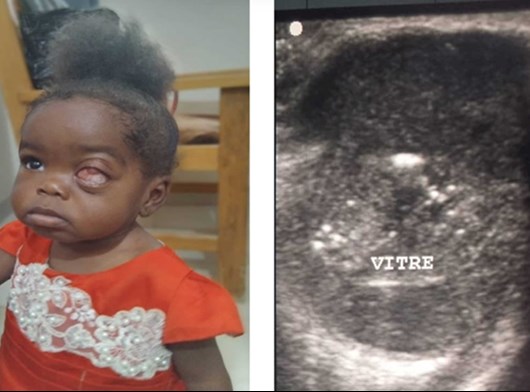 A 19-month-old girl presented with left leukocoria and proptosis first noted at three months of age. Examination revealed a hyperaemic eye with corneal haze and no fundal view. The only available investigation was ultrasound (Figure 4), which demonstrated vitreous calcification. Lumbar puncture, MRI and CT were either unavailable or unaffordable.