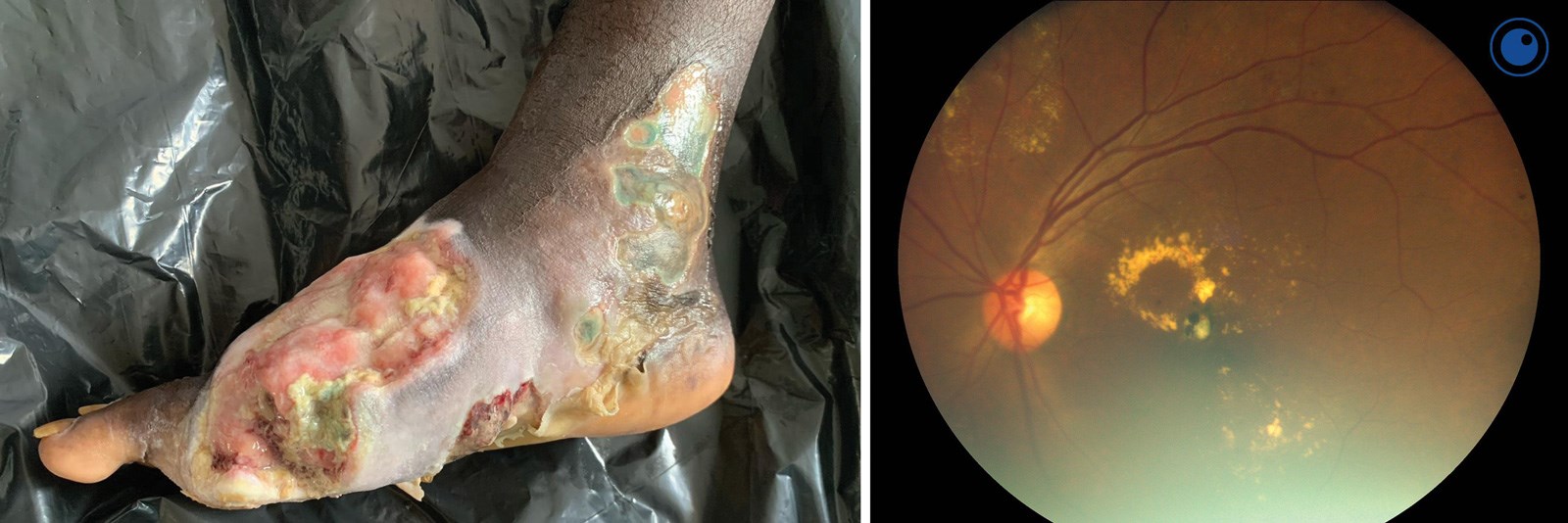 Despite these successes, both initiatives faced some challenges. Resource constraints, including limited equipment and staff shortages hindered service delivery. In Eswatini, a single government podiatrist and ophthalmologist served the entire country, emphasising the need for task-shifting to train other healthcare workers. Late presentation of patients with advanced complications, including necrotic toes and severe visual impairment (Figure 3), highlighted the urgency of improving early detection and referral systems. Staff turnover and a lack of confidence in performing screenings were additional barriers. High turnover rates among nurses in Eswatini, coupled with rotational duties, led to a loss of screening skills. These challenges underscore the importance of continuous training and quality assurance mechanisms.