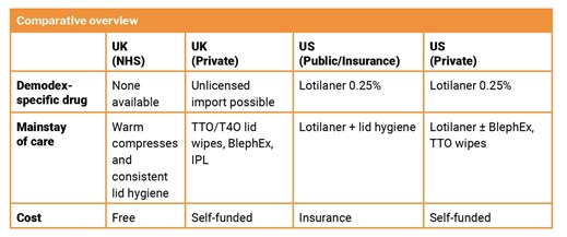 The approval of lotilaner in the US marks a new era of targeted therapy for Demodex blepharitis. MHRA evaluation in the UK will be a welcome development which potentially aligns UK practice with international standards. Until then, the NHS approach remains grounded in conservative management, supplemented by innovation within the private sector.