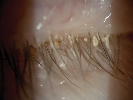 Figure 2: Left eye with Demodex blepharitis. Cylindrical collarettes encircling the lash bases which represent epithelial debris and Demodex mite waste product.
