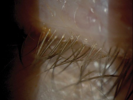 Figure 1: Right eye with Demodex blepharitis. Cylindrical collarettes encircling the lash bases which represent epithelial debris and Demodex mite waste product.