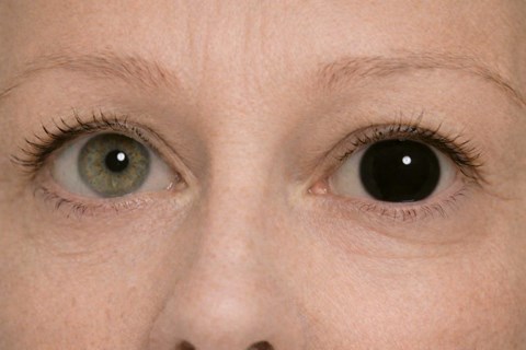 An anonymised close-up image of the patient’s eyes demonstrating marked unilateral mydriasis of the left pupil compared with a normal right pupil.