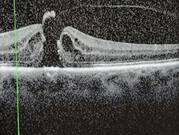 Assessment in the surgical retina clinic revealed a macular hole with cataract and Figure 3 shows their preoperative macula optical coherence tomography (OCT) scan. The patient was promptly placed on the surgical waiting list and underwent vitrectomy with internal limiting membrane peel, C2F6 gas tamponade, phacoemulsification with intraocular lens insertion and retinopexy.