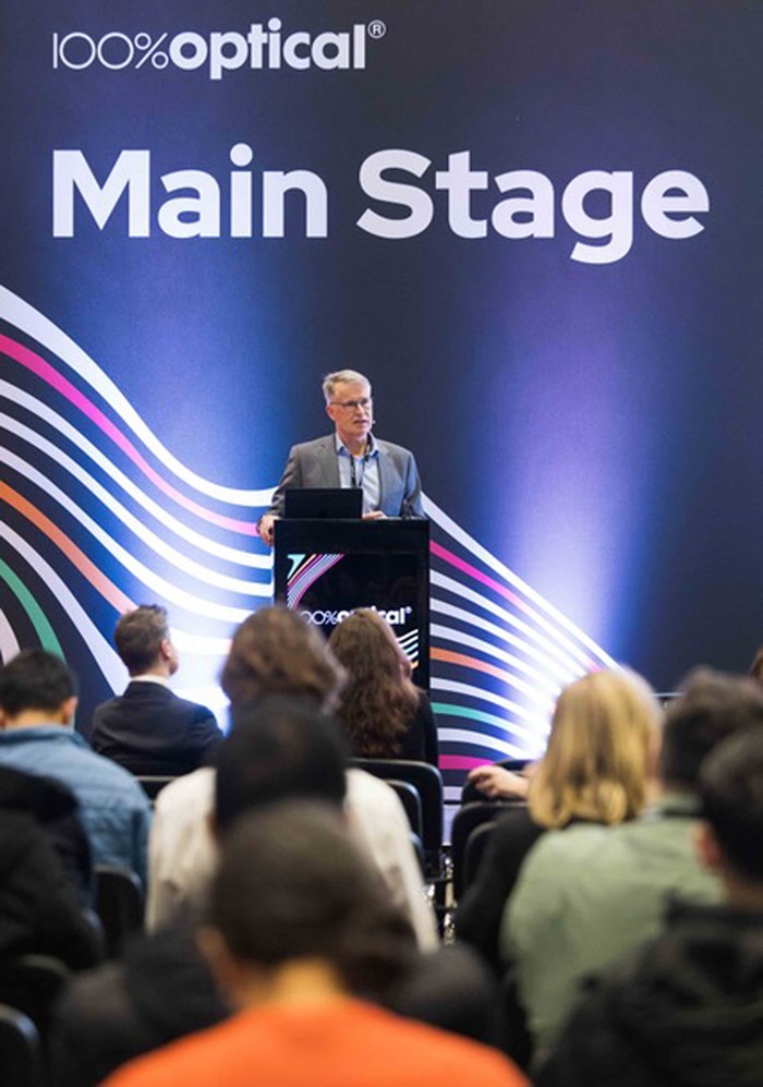 Newmedica medical director Nigel Kirkpatrick speaking at 100% Optical 2026.