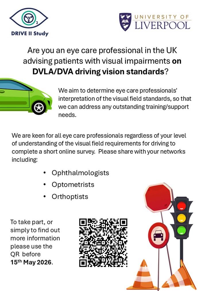 To this end, they would like to ask these professionals to take part in a short, online survey (https://forms.office.com/e/GNXJi8EMLC) to understand their current knowledge interpreting the visual field guidelines for driving.