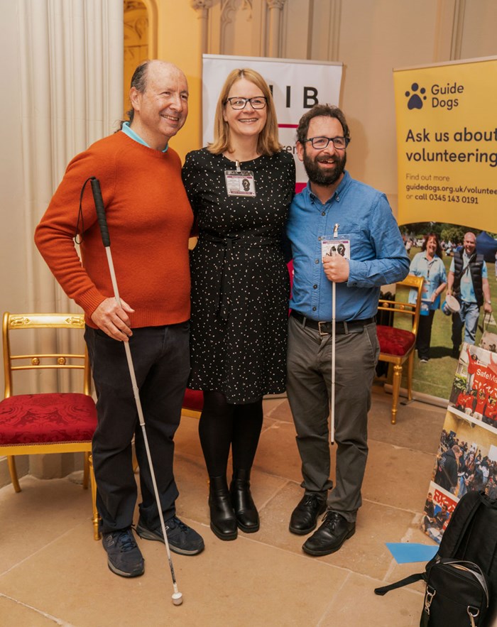 Volunteers Jonathan Abro and Simon Holt with Jo Keller, Head of Volunteering Strategy and Innovation at RNIB, where Jonathan and Simon volunteer at the event held in Windsor.